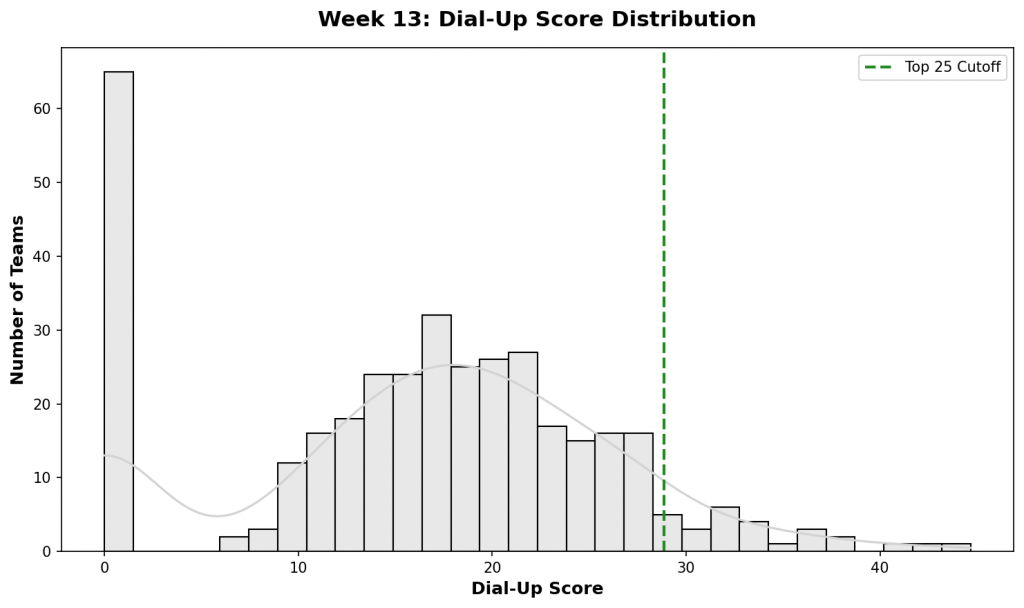 Figure 4: Distribution of Dial-Up scores across all Division I teams. The top 25 teams (highlighted in green) represent those with the most extreme performance splits based on opponent quality.