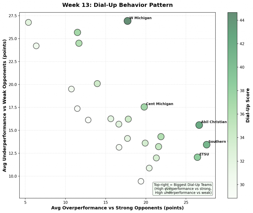Figure 3: Scatter plot showing the relationship between overperformance against strong opponents (x-axis) and underperformance against weak opponents (y-axis). Bubble size and color indicate Dial-Up score magnitude. Top-right quadrant represents the biggest Dial-Up teams.