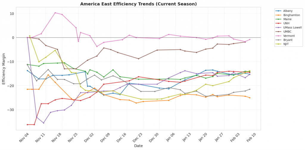 Figure 1: Efficiency margin trends for America East teams throughout the season. Teams trending upward show improving performance, while downward trends indicate struggles.