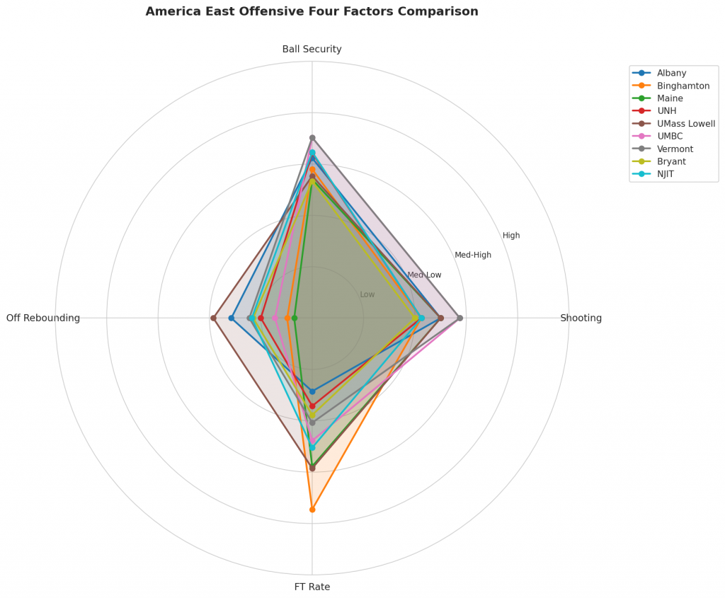 Figure 2: Offensive Four Factors comparison across America East teams. The radar chart shows each team’s shooting efficiency (eFG%), ball security (TOV%), offensive rebounding (OREB%), and free throw generation (FT Rate).