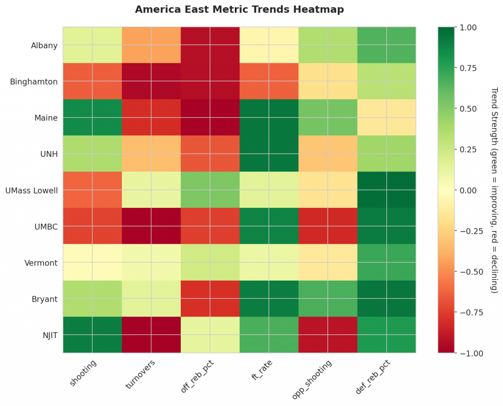 As America East teams continue their season, the MACD trending indicators will help identify which teams are genuinely improving versus those riding unsustainable momentum. Check back next week for updated analysis.
