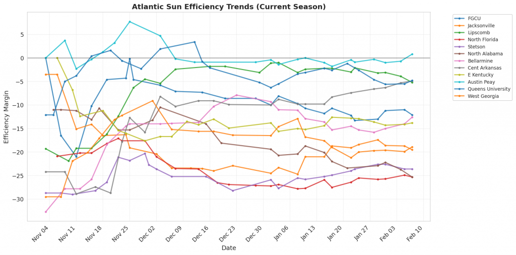 Figure 1: Efficiency margin trends for Atlantic Sun teams throughout the season. Teams trending upward show improving performance, while downward trends indicate struggles.