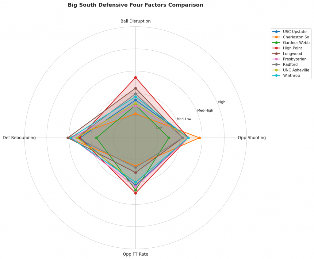 Figure 3: Defensive Four Factors comparison across Big South teams. The radar chart shows each team’s opponent shooting defense (Opp eFG%), ball disruption (forcing TOV%), defensive rebounding (DREB%), and opponent free throw prevention (Opp FT Rate).