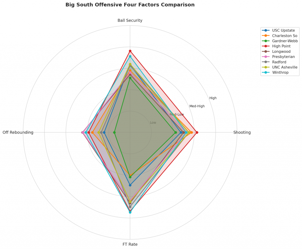 Figure 2: Offensive Four Factors comparison across Big South teams. The radar chart shows each team’s shooting efficiency (eFG%), ball security (TOV%), offensive rebounding (OREB%), and free throw generation (FT Rate).