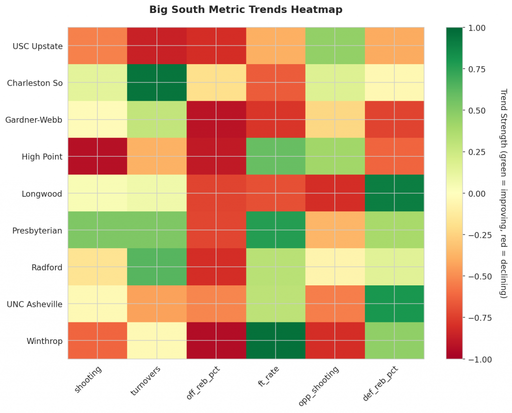 - Trending Down (Efficiency): USC Upstate, Gardner-Webb, High Point, Radford, UNC Asheville
