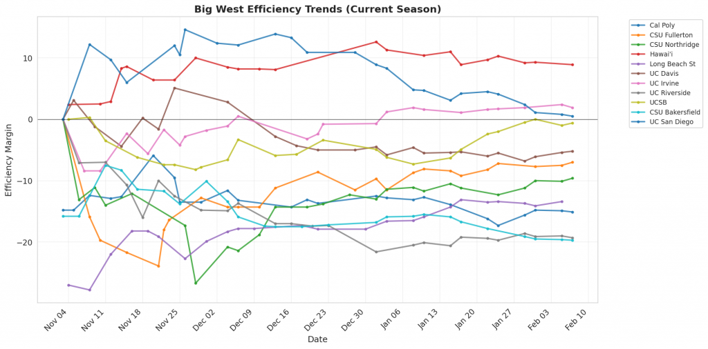 Figure 1: Efficiency margin trends for Big West teams throughout the season. Teams trending upward show improving performance, while downward trends indicate struggles.