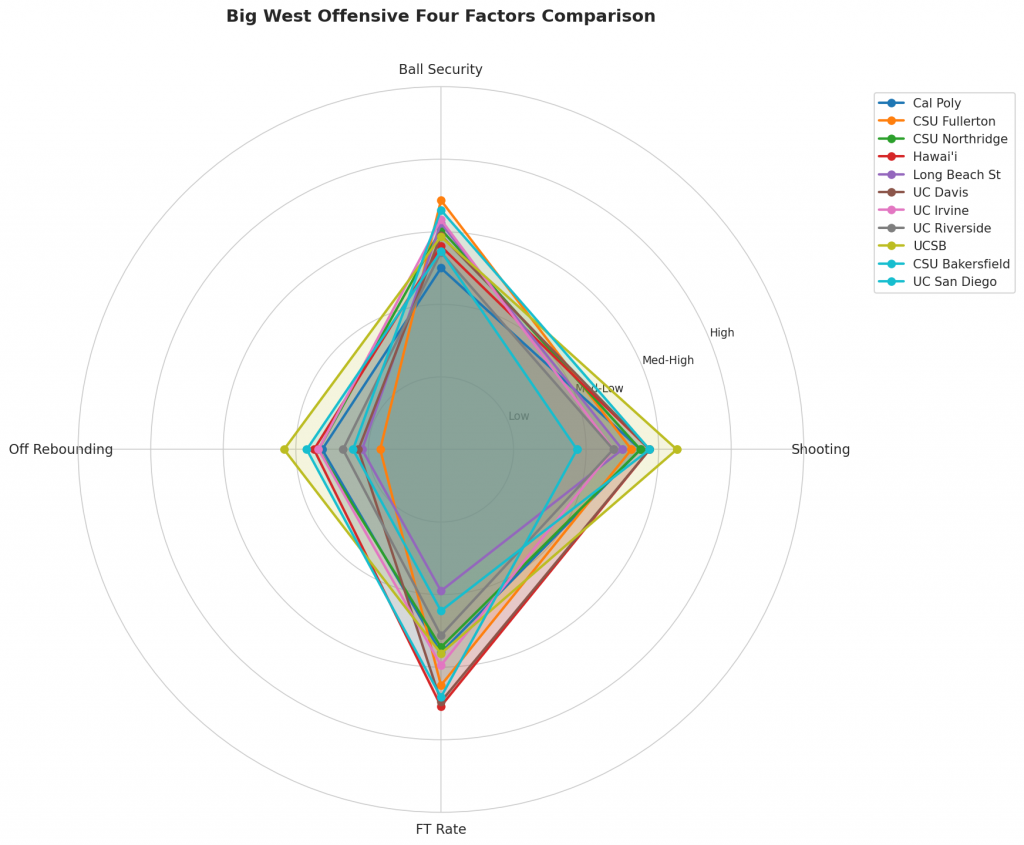 Figure 2: Offensive Four Factors comparison across Big West teams. The radar chart shows each team’s shooting efficiency (eFG%), ball security (TOV%), offensive rebounding (OREB%), and free throw generation (FT Rate).