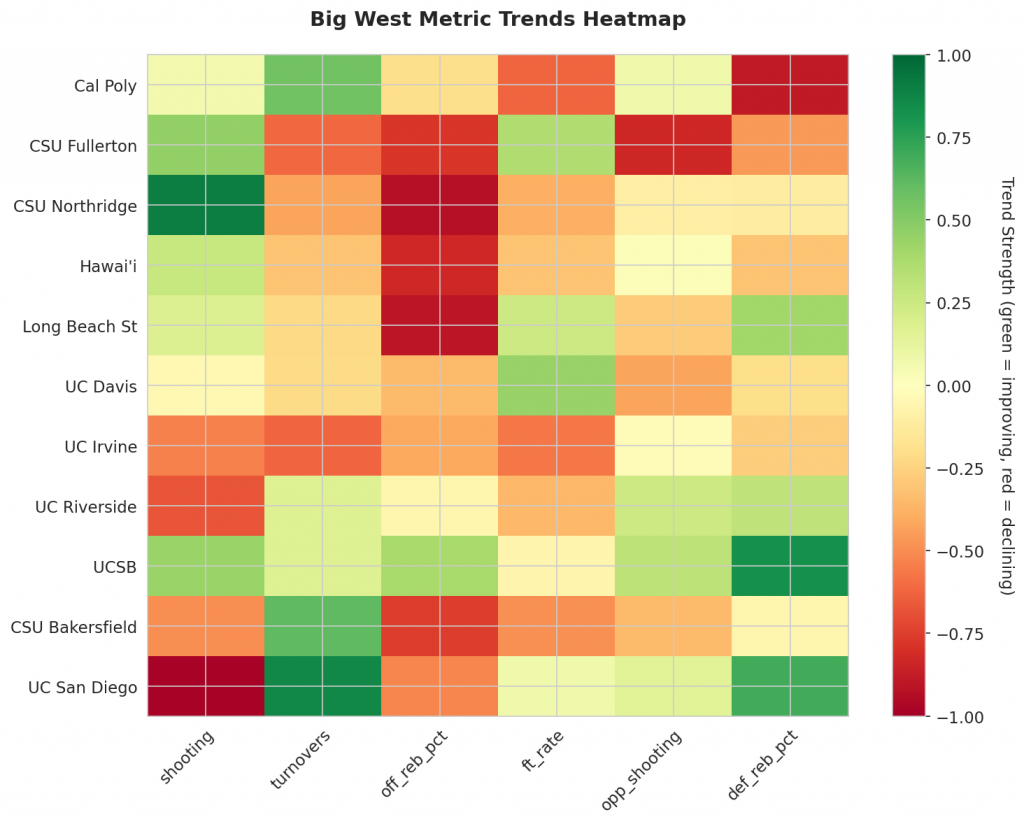 As Big West teams continue their season, the MACD trending indicators will help identify which teams are genuinely improving versus those riding unsustainable momentum. Check back next week for updated analysis.