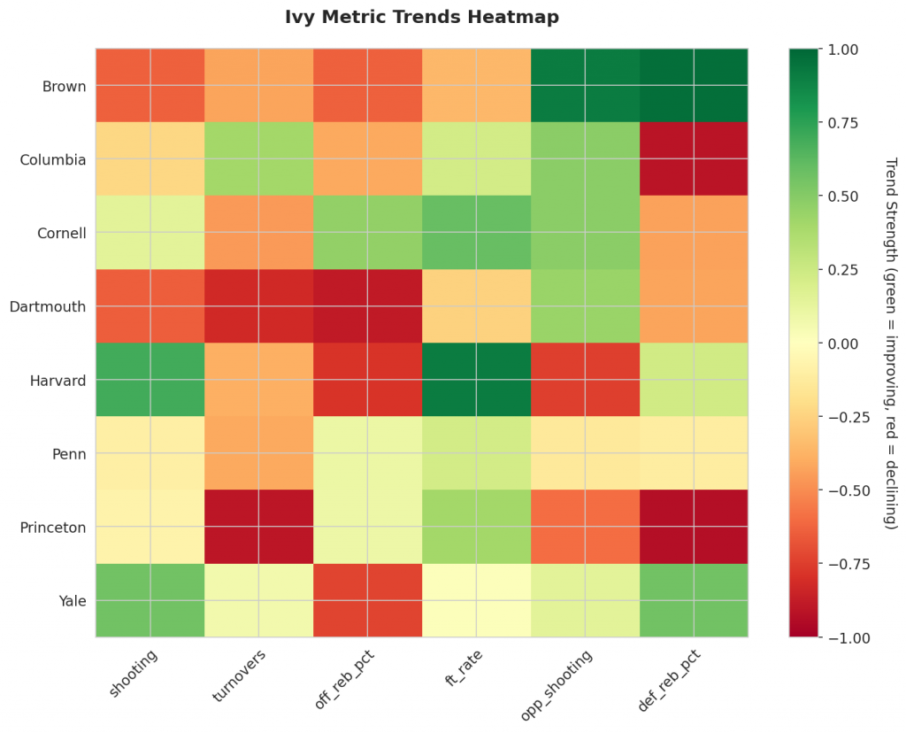 Figure 1: Efficiency margin trends for Ivy teams throughout the season. Teams trending upward show improving performance, while downward trends indicate struggles.