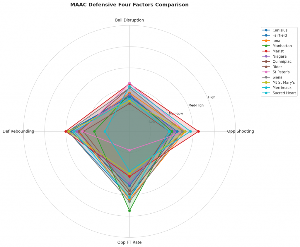 Figure 3: Defensive Four Factors comparison across MAAC teams. The radar chart shows each team’s opponent shooting defense (Opp eFG%), ball disruption (forcing TOV%), defensive rebounding (DREB%), and opponent free throw prevention (Opp FT Rate).