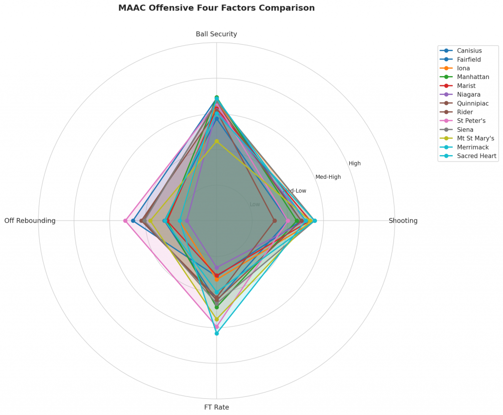 Figure 2: Offensive Four Factors comparison across MAAC teams. The radar chart shows each team’s shooting efficiency (eFG%), ball security (TOV%), offensive rebounding (OREB%), and free throw generation (FT Rate).
