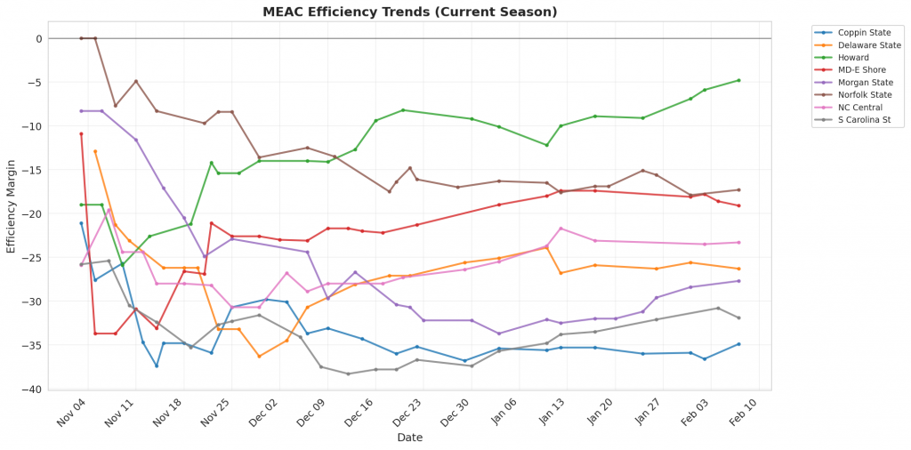 Figure 1: Efficiency margin trends for MEAC teams throughout the season. Teams trending upward show improving performance, while downward trends indicate struggles.