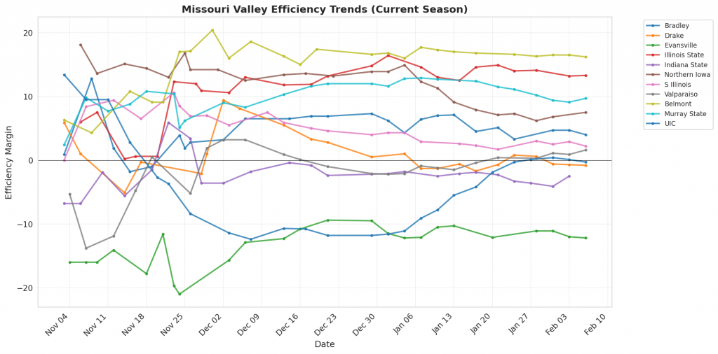 Figure 1: Efficiency margin trends for Missouri Valley teams throughout the season. Teams trending upward show improving performance, while downward trends indicate struggles.