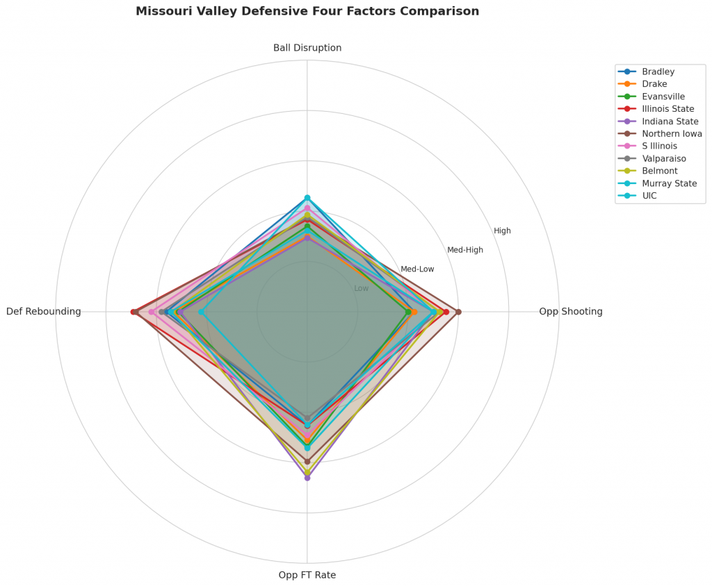 Figure 3: Defensive Four Factors comparison across Missouri Valley teams. The radar chart shows each team’s opponent shooting defense (Opp eFG%), ball disruption (forcing TOV%), defensive rebounding (DREB%), and opponent free throw prevention (Opp FT Rate).