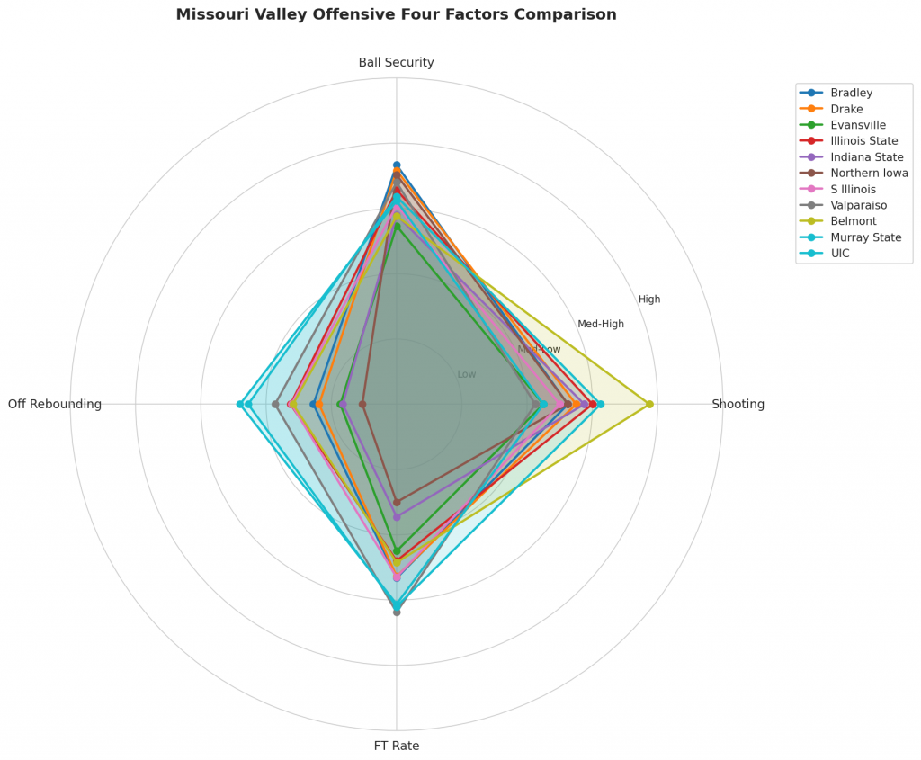 Figure 2: Offensive Four Factors comparison across Missouri Valley teams. The radar chart shows each team’s shooting efficiency (eFG%), ball security (TOV%), offensive rebounding (OREB%), and free throw generation (FT Rate).