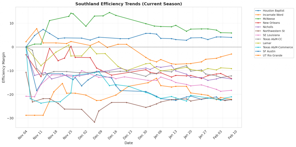 Figure 1: Efficiency margin trends for Southland teams throughout the season. Teams trending upward show improving performance, while downward trends indicate struggles.