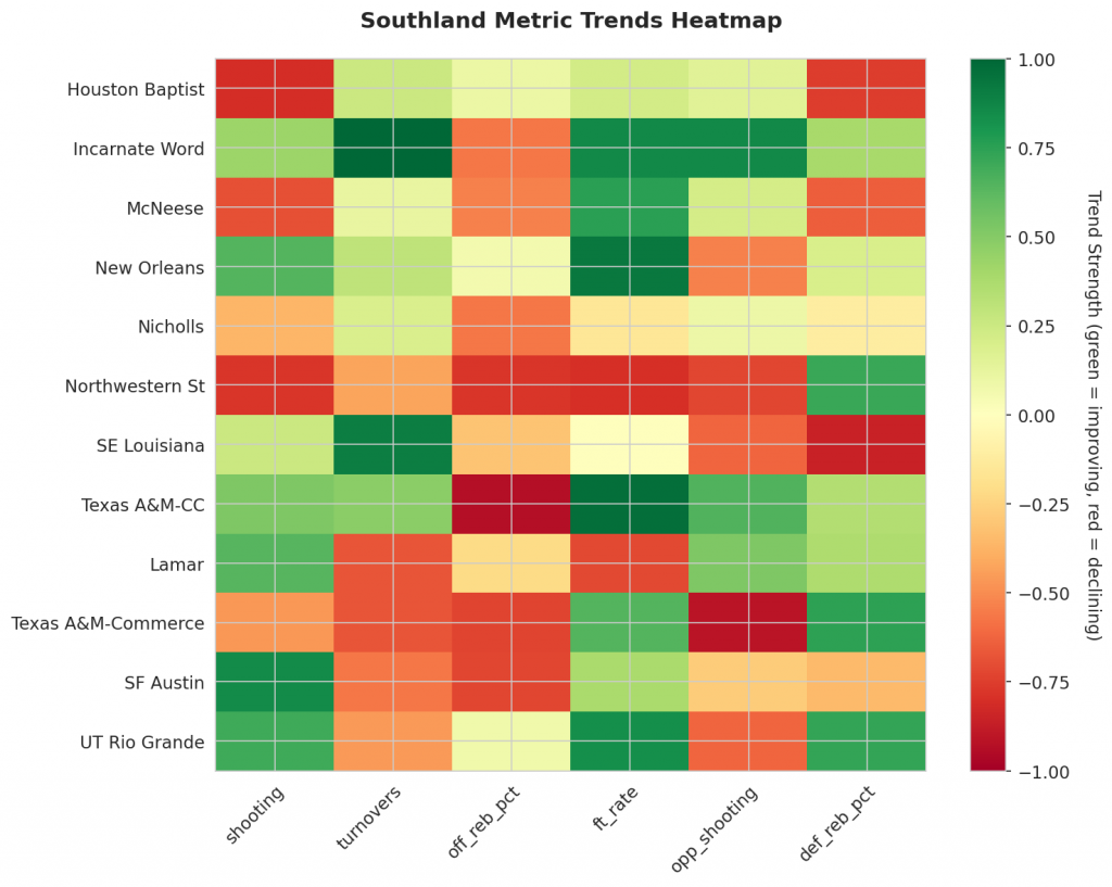 - Trending Down (Efficiency): Houston Baptist, McNeese, Nicholls, Northwestern St, Texas A&M-Commerce