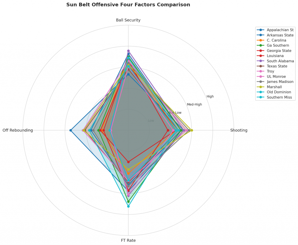 Figure 2: Offensive Four Factors comparison across Sun Belt teams. The radar chart shows each team’s shooting efficiency (eFG%), ball security (TOV%), offensive rebounding (OREB%), and free throw generation (FT Rate).