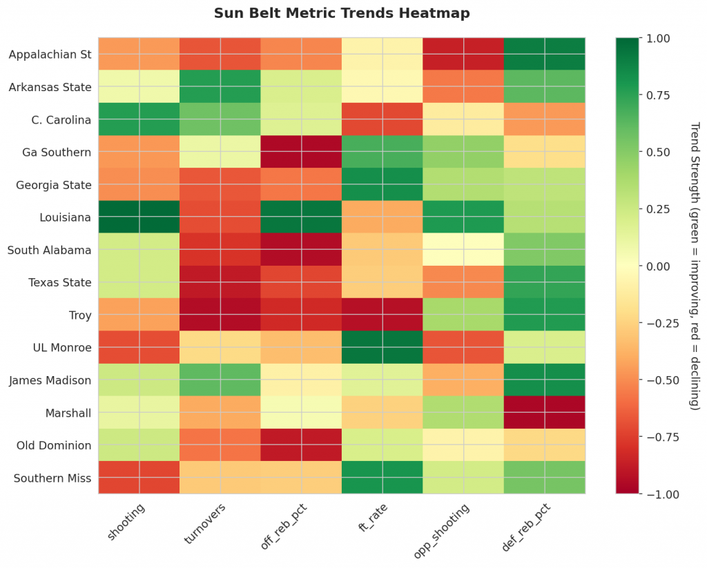 Figure 1: Efficiency margin trends for Sun Belt teams throughout the season. Teams trending upward show improving performance, while downward trends indicate struggles.