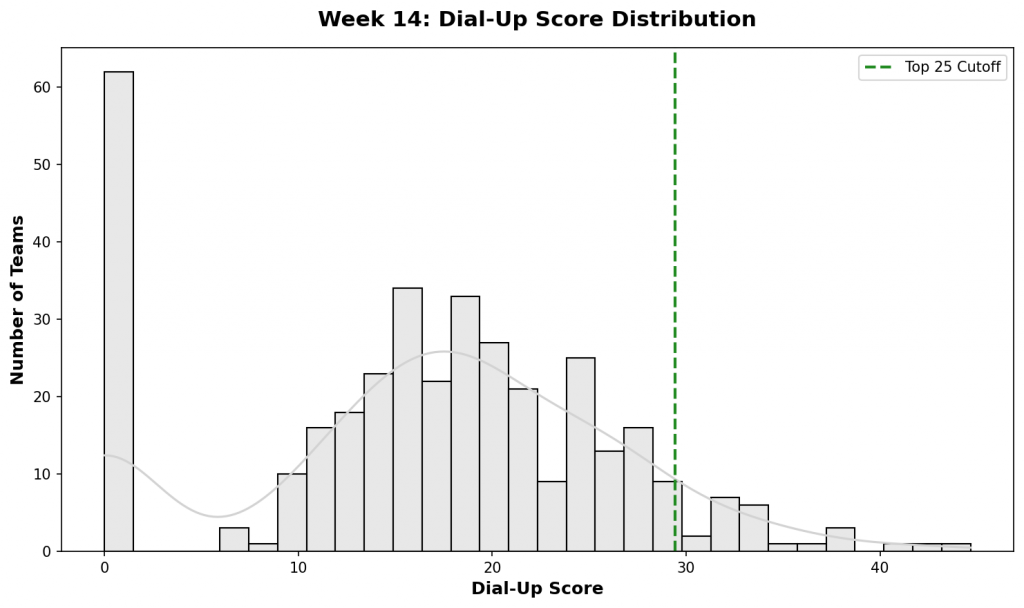 Figure 4: Distribution of Dial-Up scores across all Division I teams. The top 25 teams (highlighted in green) represent those with the most extreme performance splits based on opponent quality.