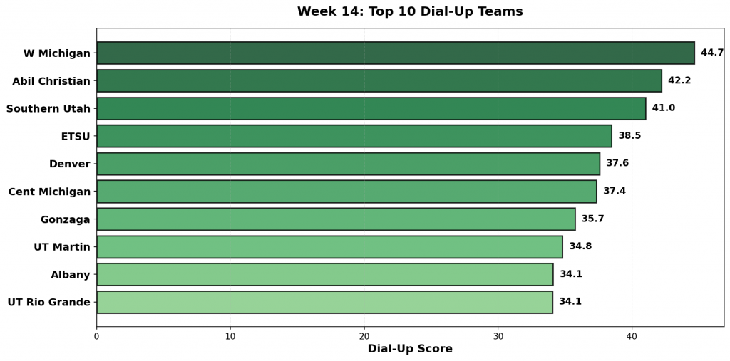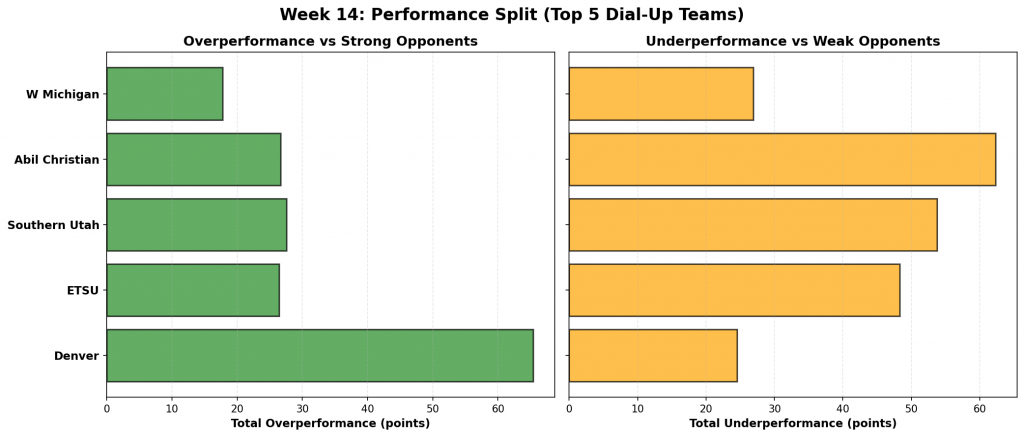 Figure 1: Top 10 teams with the highest Dial-Up scores in Week 14. Scores reflect the combination of overperformance against strong opponents and underperformance against weak ones.