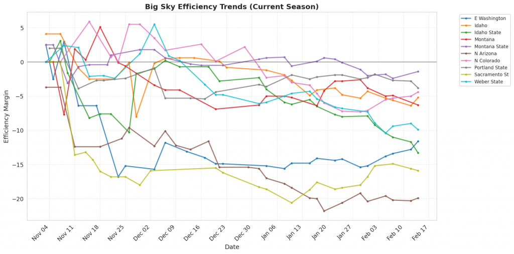 Figure 1: Efficiency margin trends for Big Sky teams throughout the season. Teams trending upward show improving performance, while downward trends indicate struggles.