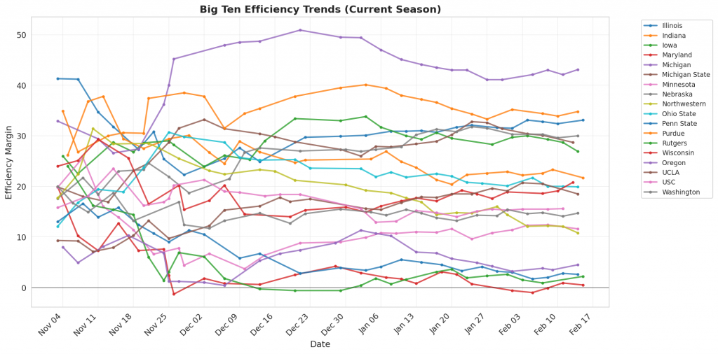 Figure 1: Efficiency margin trends for Big Ten teams throughout the season. Teams trending upward show improving performance, while downward trends indicate struggles.
