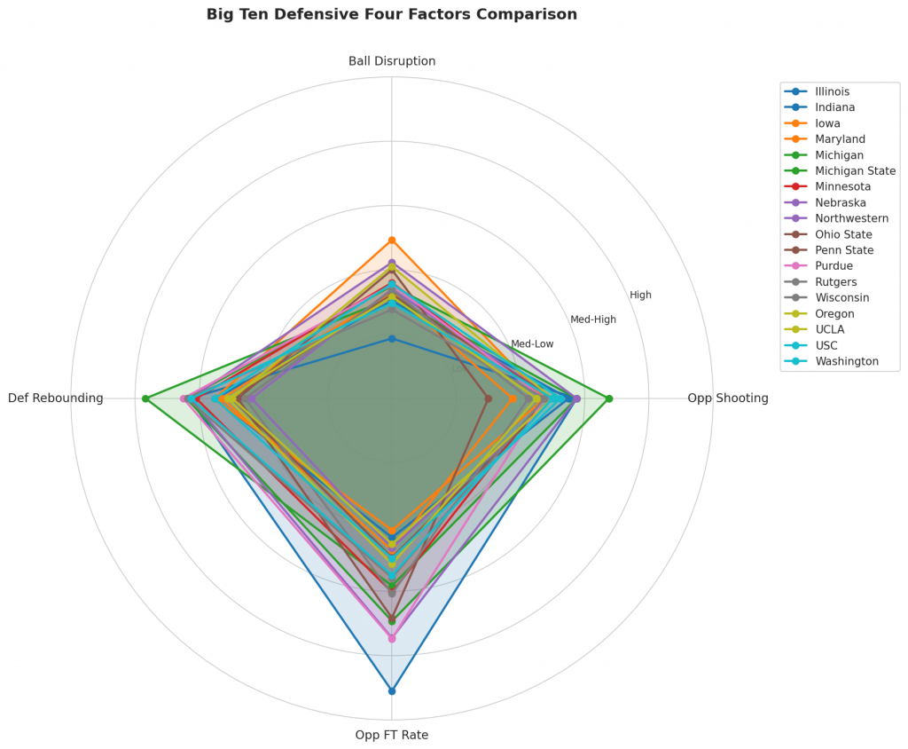 Figure 3: Defensive Four Factors comparison across Big Ten teams. The radar chart shows each team’s opponent shooting defense (Opp eFG%), ball disruption (forcing TOV%), defensive rebounding (DREB%), and opponent free throw prevention (Opp FT Rate).
