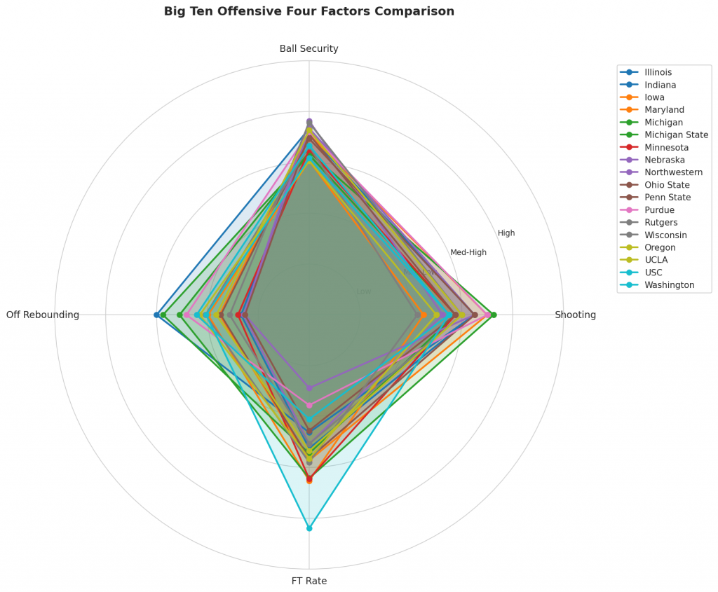 Figure 2: Offensive Four Factors comparison across Big Ten teams. The radar chart shows each team’s shooting efficiency (eFG%), ball security (TOV%), offensive rebounding (OREB%), and free throw generation (FT Rate).