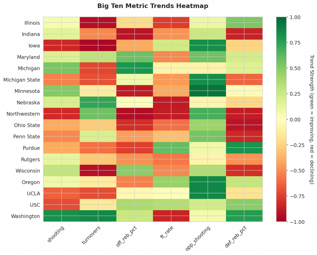 - Trending Down (Efficiency): Iowa, Michigan State, Northwestern, Ohio State, Penn State