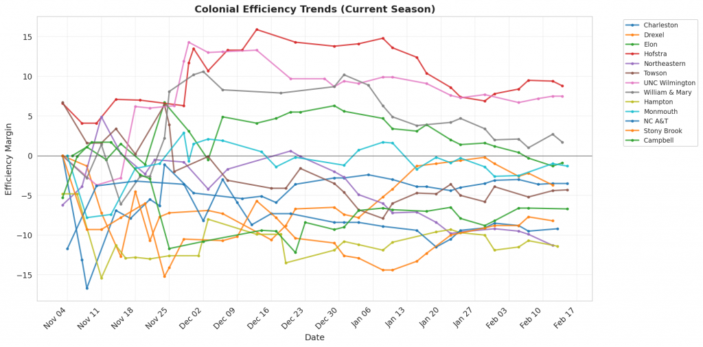 Figure 1: Efficiency margin trends for Colonial teams throughout the season. Teams trending upward show improving performance, while downward trends indicate struggles.