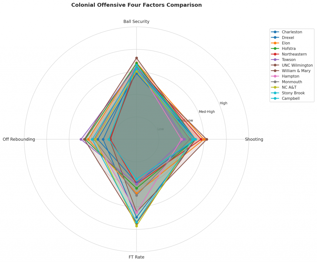 Figure 2: Offensive Four Factors comparison across Colonial teams. The radar chart shows each team’s shooting efficiency (eFG%), ball security (TOV%), offensive rebounding (OREB%), and free throw generation (FT Rate).