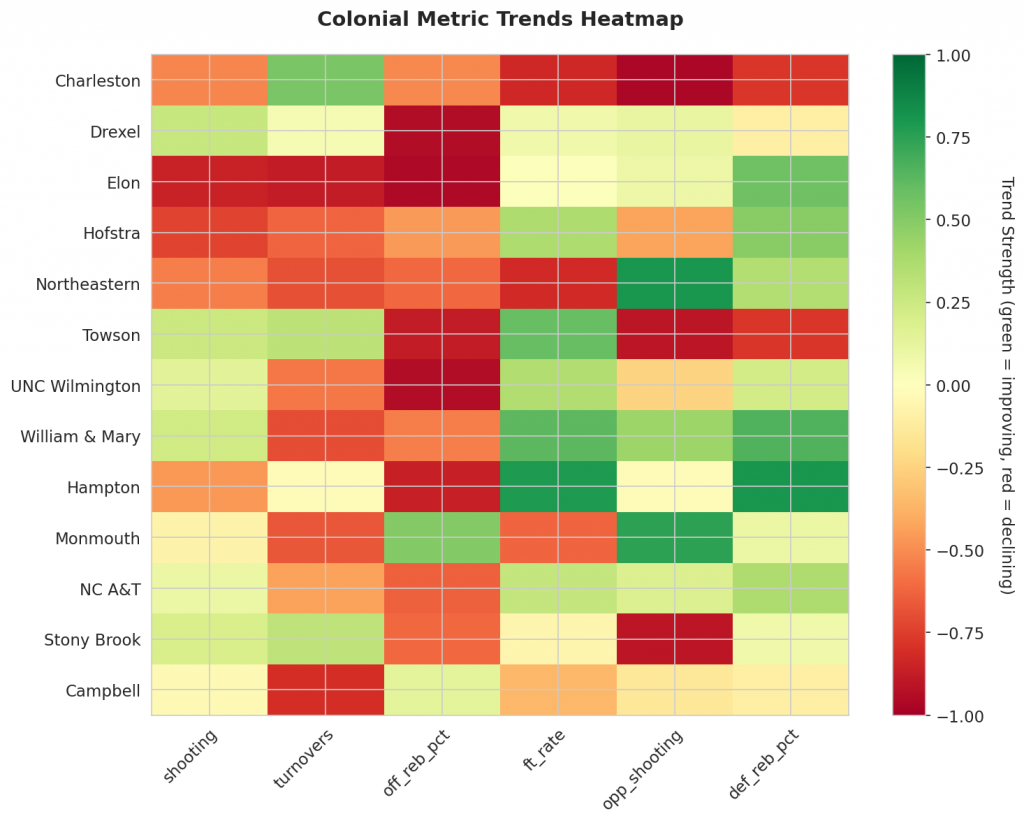 - Trending Down (Efficiency): Charleston, Elon, Hofstra, Northeastern, Hampton