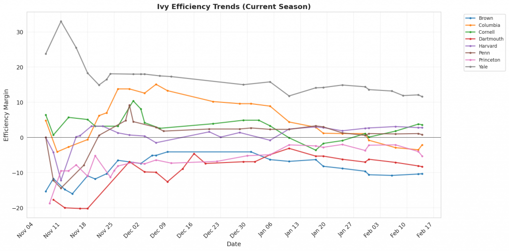 Figure 1: Efficiency margin trends for Ivy teams throughout the season. Teams trending upward show improving performance, while downward trends indicate struggles.