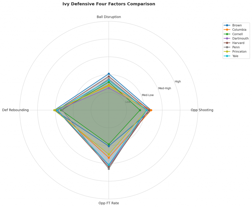 Figure 3: Defensive Four Factors comparison across Ivy teams. The radar chart shows each team’s opponent shooting defense (Opp eFG%), ball disruption (forcing TOV%), defensive rebounding (DREB%), and opponent free throw prevention (Opp FT Rate).