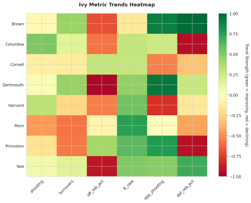 - Trending Down (Efficiency): Brown, Cornell, Penn, Princeton