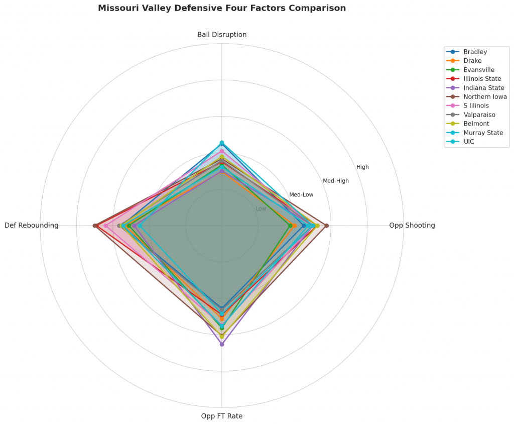 Figure 3: Defensive Four Factors comparison across Missouri Valley teams. The radar chart shows each team’s opponent shooting defense (Opp eFG%), ball disruption (forcing TOV%), defensive rebounding (DREB%), and opponent free throw prevention (Opp FT Rate).