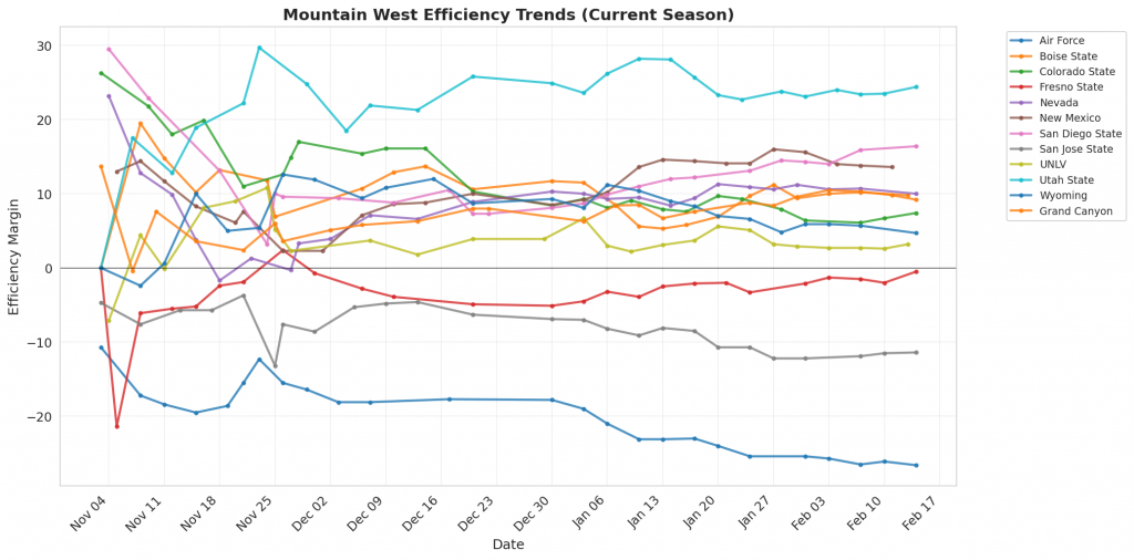 Figure 1: Efficiency margin trends for Mountain West teams throughout the season. Teams trending upward show improving performance, while downward trends indicate struggles.