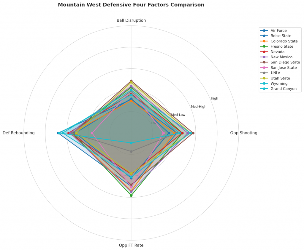 Figure 3: Defensive Four Factors comparison across Mountain West teams. The radar chart shows each team’s opponent shooting defense (Opp eFG%), ball disruption (forcing TOV%), defensive rebounding (DREB%), and opponent free throw prevention (Opp FT Rate).