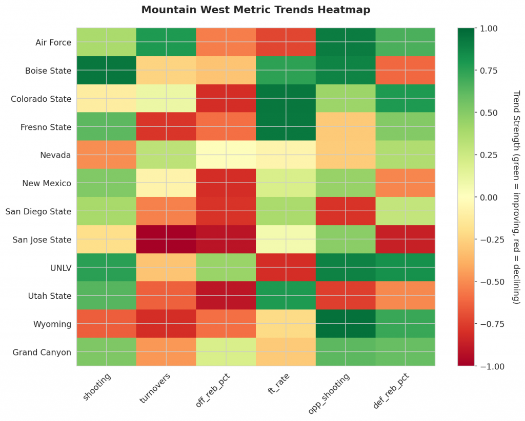 - Trending Down (Efficiency): Colorado State, Nevada, San Jose State, Wyoming