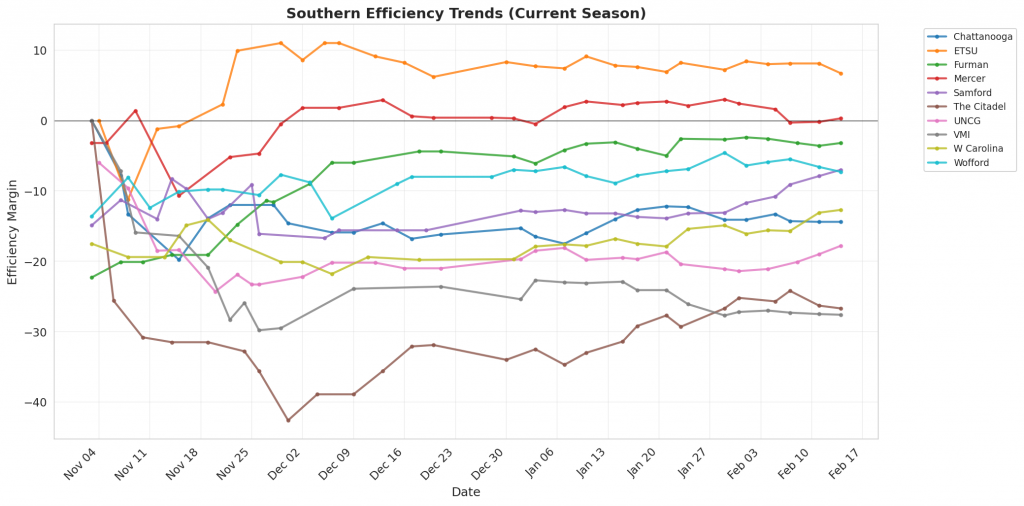 Figure 1: Efficiency margin trends for Southern teams throughout the season. Teams trending upward show improving performance, while downward trends indicate struggles.