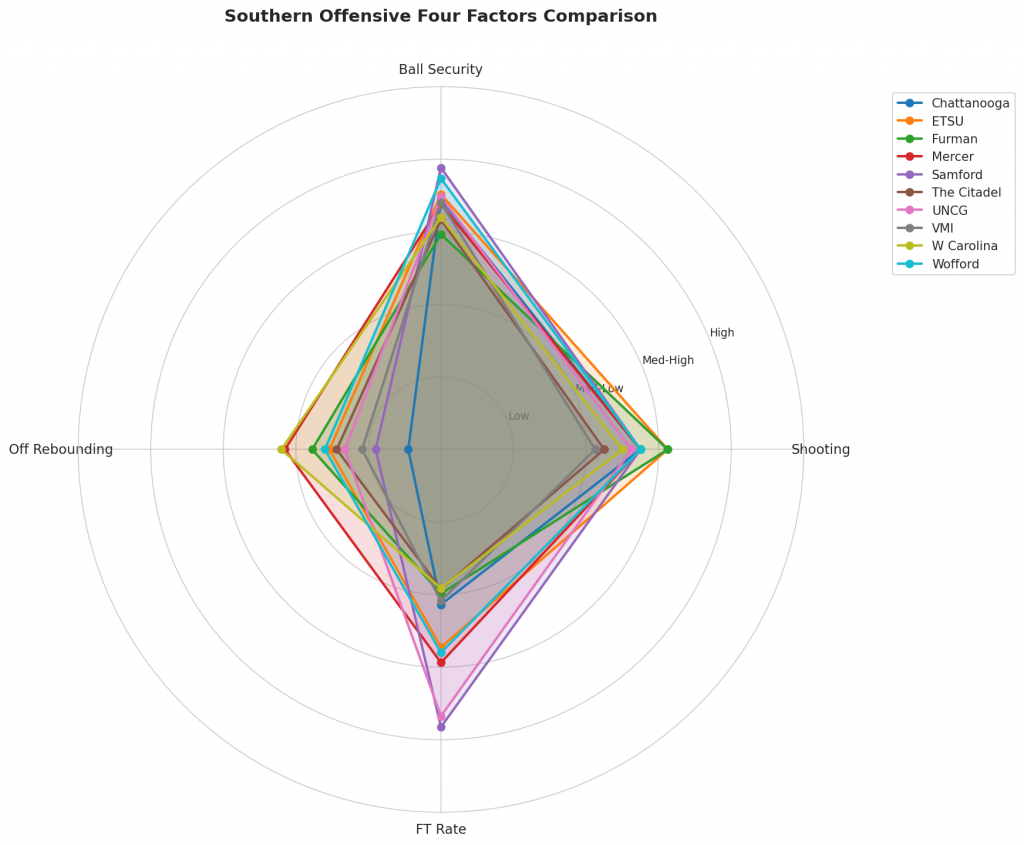 Figure 2: Offensive Four Factors comparison across Southern teams. The radar chart shows each team’s shooting efficiency (eFG%), ball security (TOV%), offensive rebounding (OREB%), and free throw generation (FT Rate).