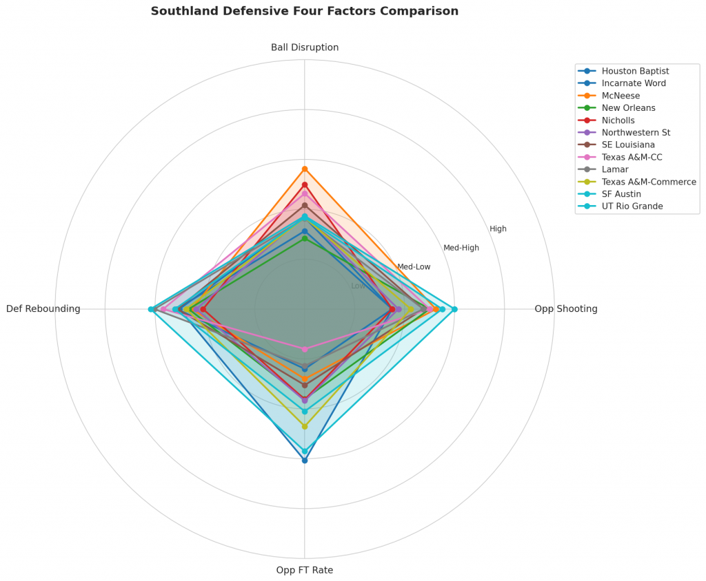 Figure 3: Defensive Four Factors comparison across Southland teams. The radar chart shows each team’s opponent shooting defense (Opp eFG%), ball disruption (forcing TOV%), defensive rebounding (DREB%), and opponent free throw prevention (Opp FT Rate).