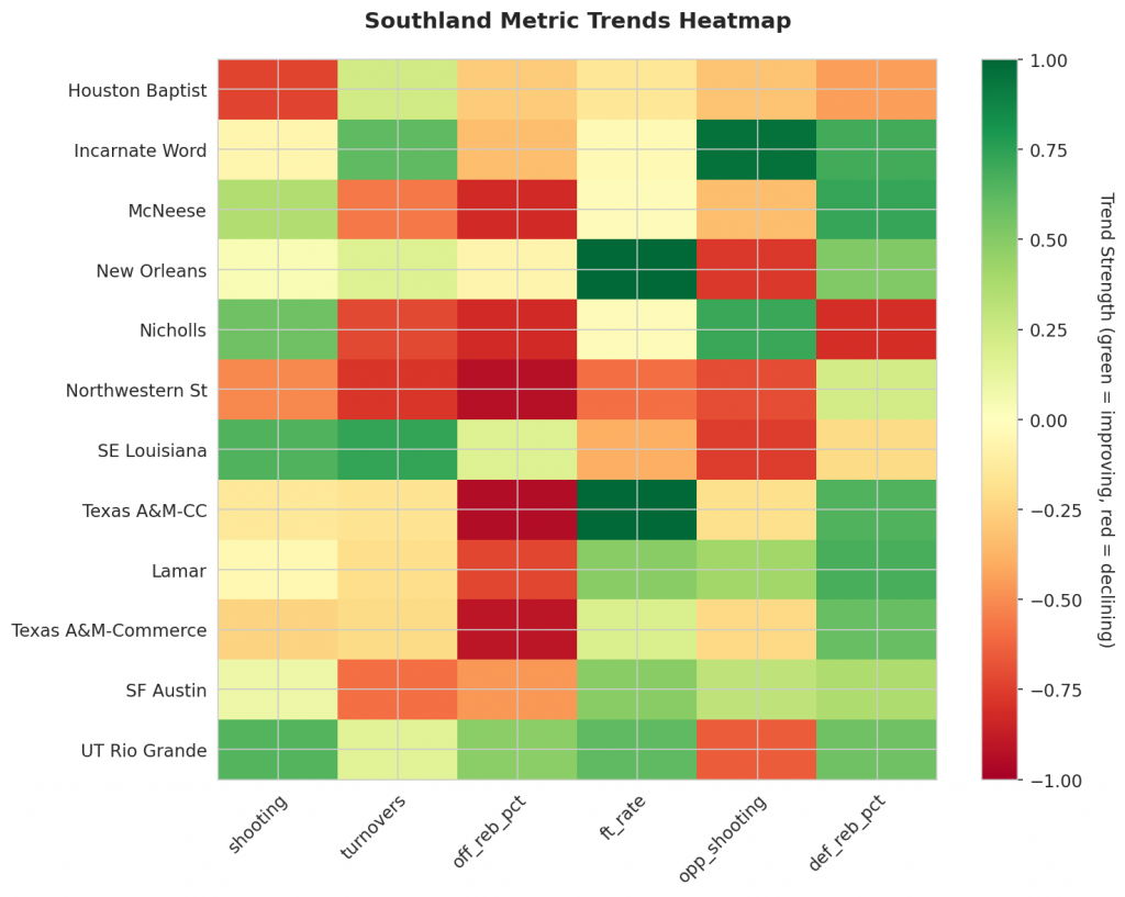 - Trending Down (Efficiency): Houston Baptist, Incarnate Word, Northwestern St, Texas A&M-CC, Lamar