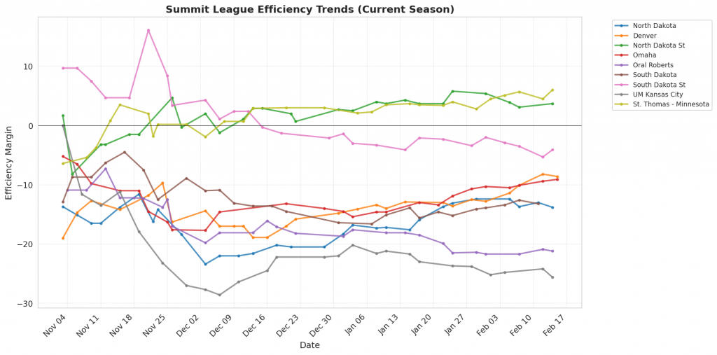 Figure 1: Efficiency margin trends for Summit League teams throughout the season. Teams trending upward show improving performance, while downward trends indicate struggles.
