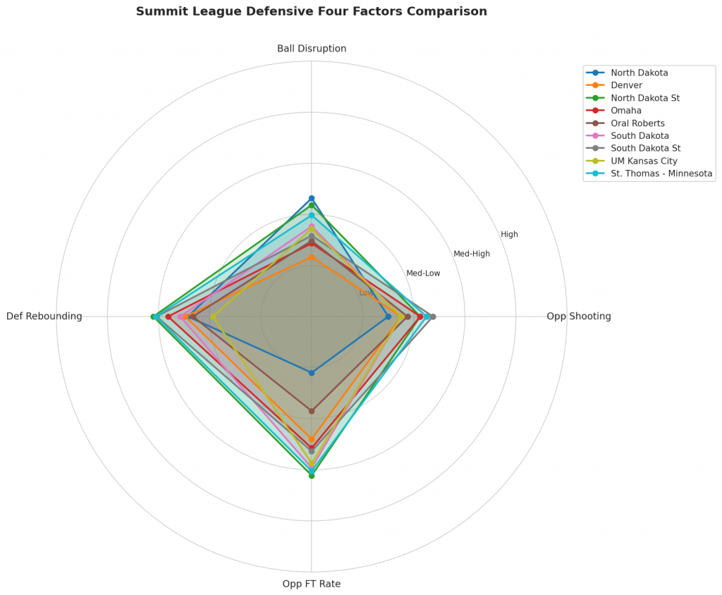 Figure 3: Defensive Four Factors comparison across Summit League teams. The radar chart shows each team’s opponent shooting defense (Opp eFG%), ball disruption (forcing TOV%), defensive rebounding (DREB%), and opponent free throw prevention (Opp FT Rate).
