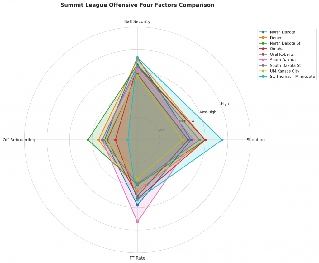 Figure 2: Offensive Four Factors comparison across Summit League teams. The radar chart shows each team’s shooting efficiency (eFG%), ball security (TOV%), offensive rebounding (OREB%), and free throw generation (FT Rate).