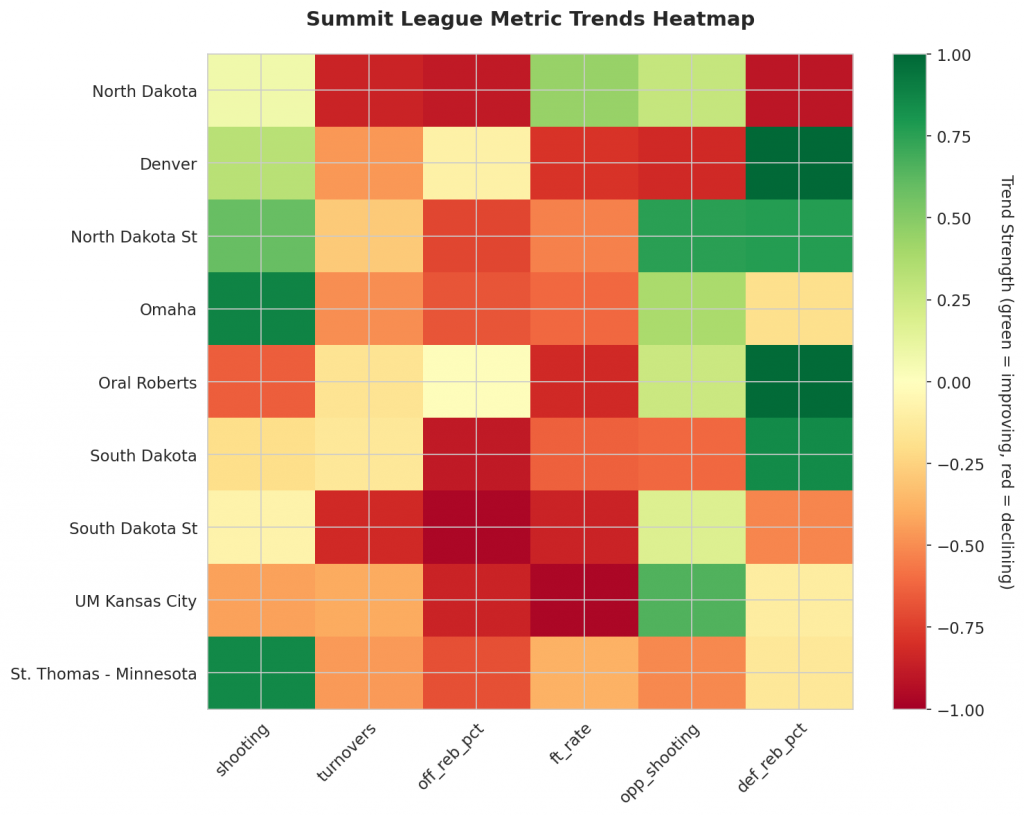As the Summit League season continues, we examine key trends in offense and defense to understand which teams are genuinely improving versus those riding unsustainable momentum.
