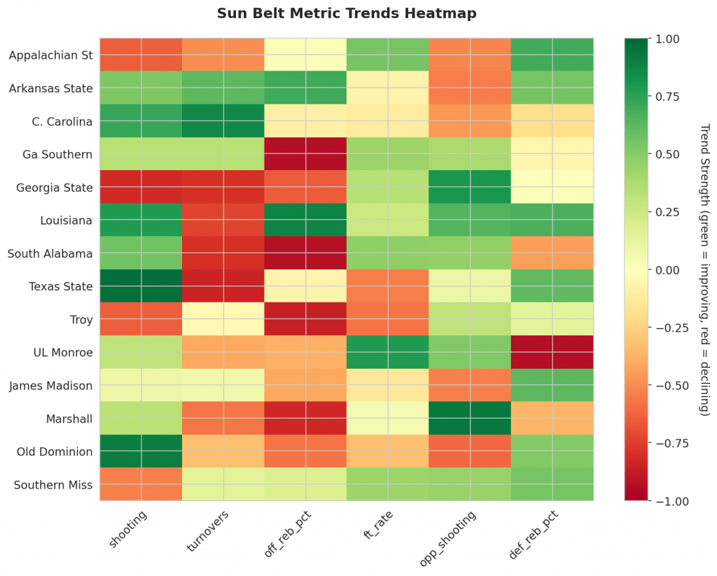 - Trending Down (Efficiency): Appalachian St, Georgia State, Troy, Southern Miss