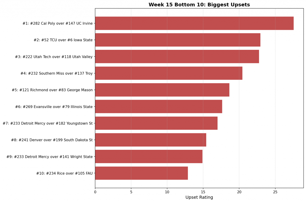 This week saw 10 upsets shake up the landscape, with an average margin of victory of just 7.6 points. The action was incredibly competitive, featuring 3 games decided by 5 points or less and 1 blowouts (15+ points). The lowest-ranked team to secure a win was #282 Cal Poly.